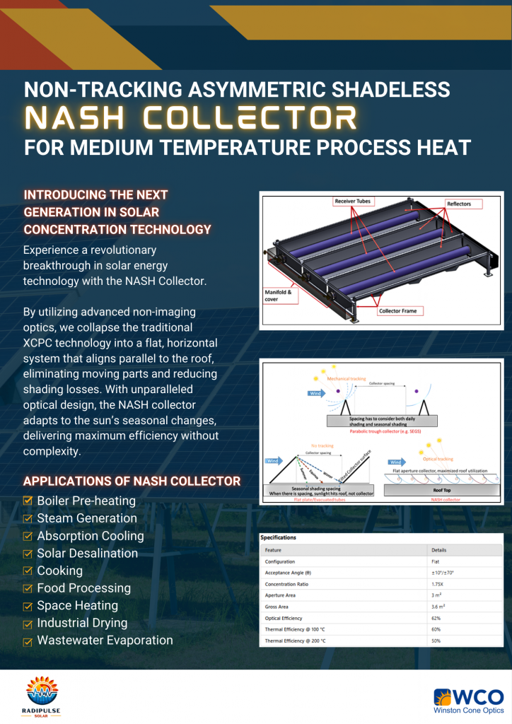 - Our non-imaging solar collectors are designed to concentrate solar radiation year-round from a stationary position, with no moving parts.
